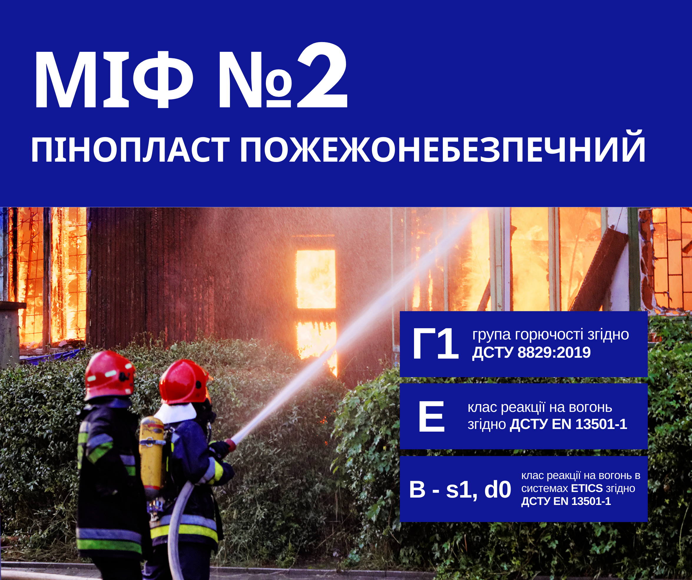 Легенда про те, що пінопласт пожежонебезпечний має коріння ще з радянських часів, коли якість і технологія виробництва пінопласту суттєво відрізнялися від сучасних стандартів. Сьогоднішній пінопласт – це високоякісний самозатухаючий матеріал, який не поширює полум’я. Навпаки, він є найпоширенішим матеріалом для теплоізоляції в Європі, особливо у фасадних системах ETICS.